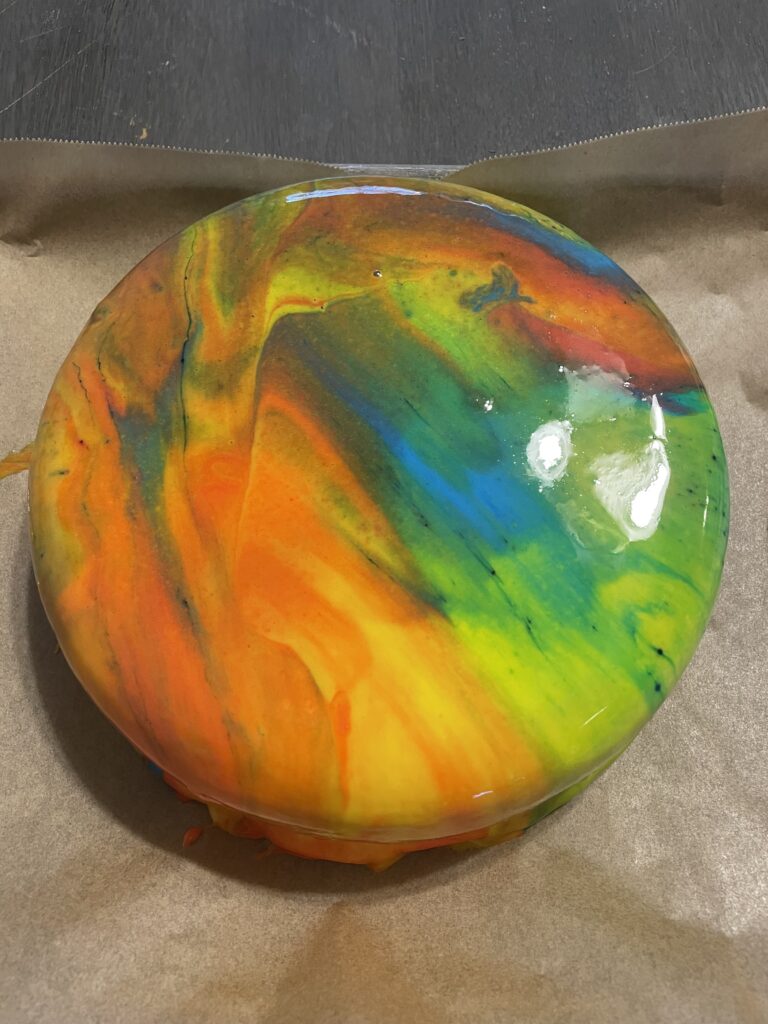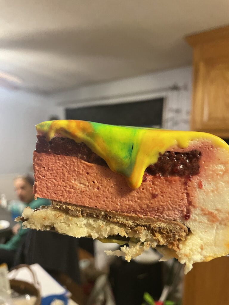Clearly too much glaze on the top, which has a bubble or two. Taken together though the flavor was pretty good. The construction ( top to bottom ), mixed berry gel->raspberry mousse->chocolate almond feuilletine for crunch->coconut dacquise and it’s all encased in coconut mousse. They mystery here is why the raspberry mousse layer is so HUGE. These layers were constructed in 2cm high silicone molds and the best I can tell is that somewhere during the thawing process, it just expanded.